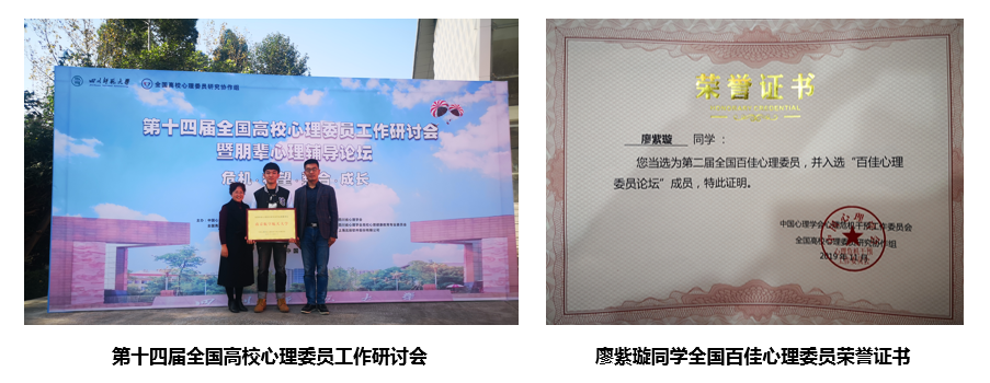 近日,第二届全国百佳心理委员论坛在四川师范大学举行,经面试和综合考虑,学校心理中心推荐91直播 廖紫璇同学与能源与动力91直播 、民航/飞行91直播 等的两位同学参加全国评优。最终,三位同学从190名参赛者中脱颖而出,成功进入前一百名,荣获“第二届全国百佳心理委员”荣誉称号。
