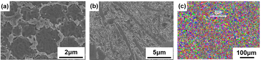 图2 激光增材制造Al基纳米/原位复合材料显微组织调控:(a)环状TiC纳米增强相;(b)条带状Al4SiC4原位增强相;(c)TiB2增强作用下Al基体细化的等轴晶组织