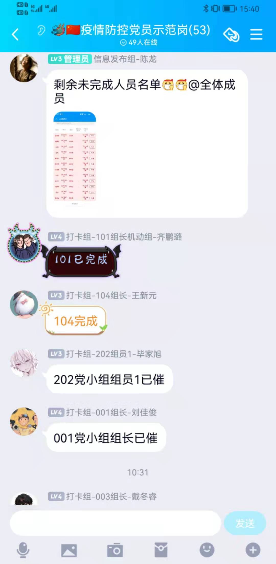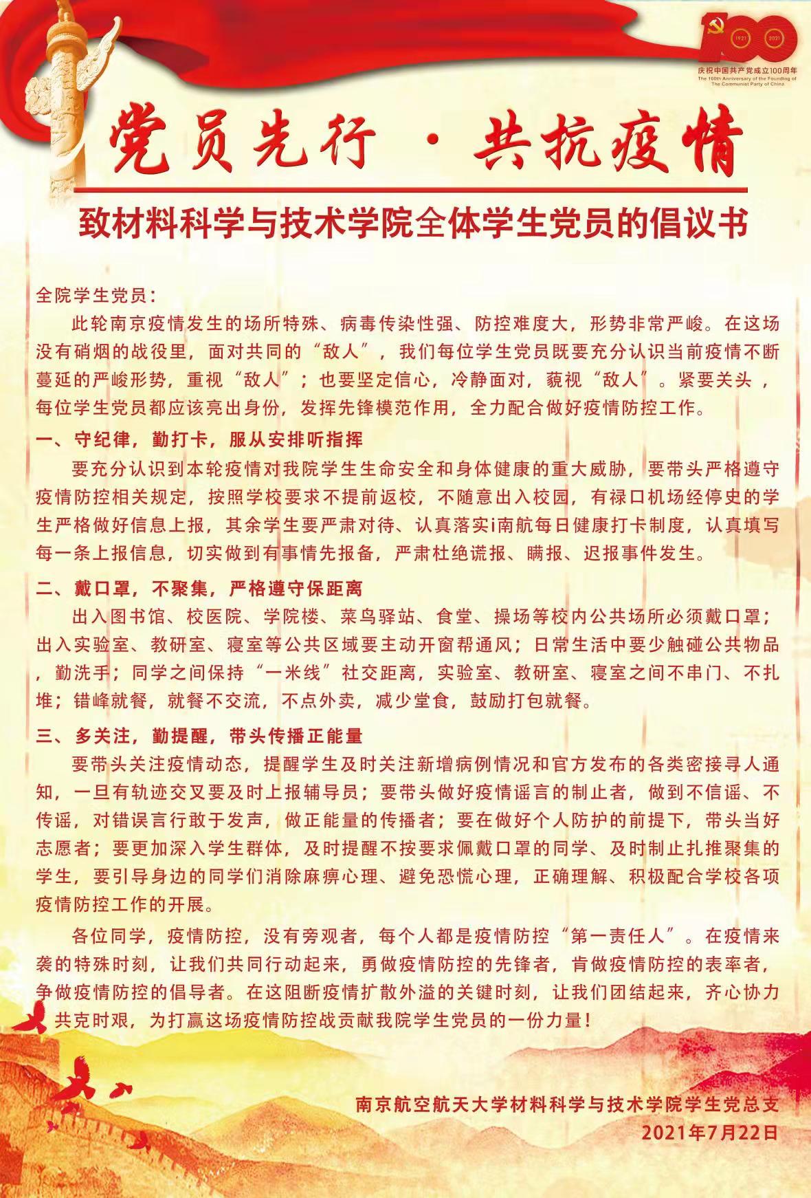 7月20日南京暴发疫情以来,91直播 师生积极投身到疫情防控工作中来,“材料楼复材实验室已全面消杀”、“91直播 生一支部所有成员已完成打卡”、“2020级全体91直播 已完成打卡”、“‘涝疫’期间每日数据已更新”、“我已于今天解除隔离,请老师放心”、“值班巡楼已完成,安全”……每天上午11点,91直播 各防疫工作群里消息不断,全院师生积极投身到疫情防控工作中,他们用行动传递了疫情中的爱与温暖,让我们看到了一幕幕感人的画面。