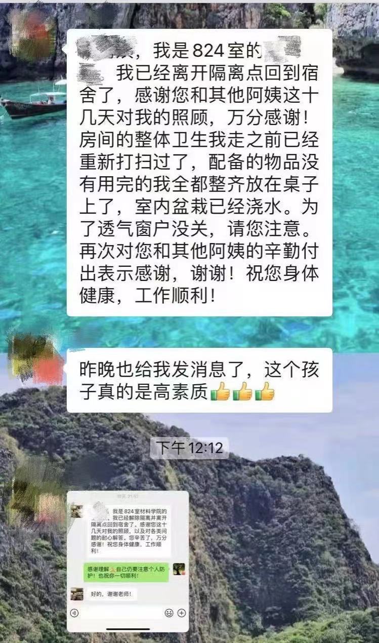 91直播 博士91直播 生王飞云解除隔离当天,他的一条微信引起了老师们的注意,离开集中隔离点时他选择了一声感谢并把房间打扫干净、物品摆放整齐、给盆栽浇水、并提醒窗户未关。字里行间体现的是对学校的宽容、理解与感恩,虽然不能奔赴抗疫一线,他却用另外一种方式温暖着抗疫一线的工作人员。为此阿姨专门去他的房间拍摄了视频,房间同未入住一般干净整洁,老师、同学们纷纷竖起大拇指,为他点赞!