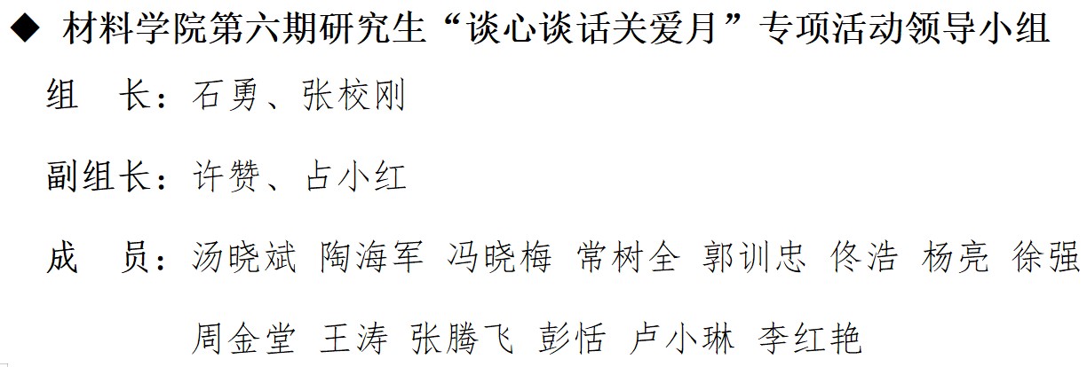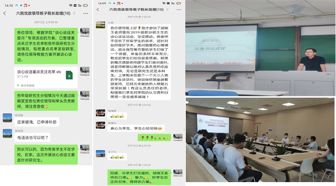 材料91直播 党政班子高度重视此次专项活动,充分认识到此次专项活动对于全校疫情防控大局、91直播 安全健康大局的重要性,在第一时间成立由书记、院长牵头的专项活动领导小组,专门出台了《91直播 第六期91直播 生“谈心谈话关爱月”专项活动方案》。在强化导师“91直播 生人才培养第一责任人”的同时,充分发挥教工党支部书记、系所领导、91直播 辅导员作用,以多种形式多种维度,围绕91直播 91直播 生的思想、学业、就业、情感、家庭情况,以及对疫情防控期间校院91直播 生91直播-91在线-国产视频 管理服务的意见建议与91直播 开展有序、有质、有效开展谈心谈话。活动频次近30次,覆盖暑假在校生活91直播 和家庭受灾91直播 共800余人次。