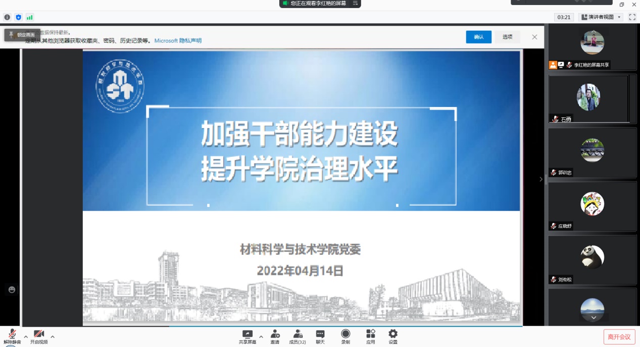 为深入贯彻学校党委指示精神,切实推进91直播 建设发展,大力提升91直播 院系两级干部的治理能力,4月14日下午,91直播 举行“凝心赋能”治理能力提升培训线上开班仪式,91直播 党委书记石勇作首场培训报告,91直播 领导班子、各系党支部书记和系主任、院级机关办公室负责人参加了学习培训。
