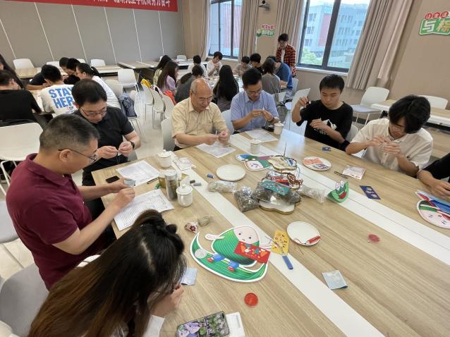 在欢快的乐曲声中,师生一起动手DIY艾草香囊,老师们不断询问同学们的近况,关心同学们的学习生活,暖暖的情意随着细密的针脚流淌在师生之间。
