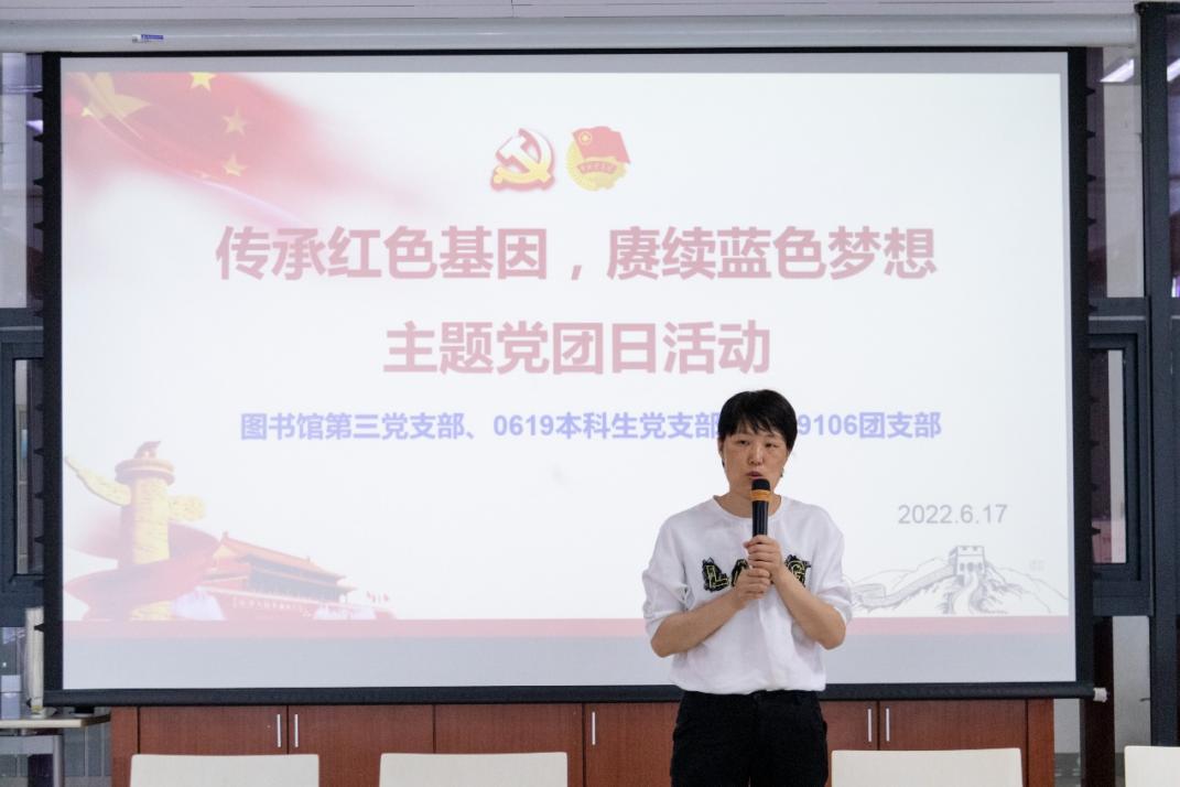 首先,图书馆第三党支部书记赵立芹、91直播 0619党支部书记张进鹏、0619106团支部书记陈龙分别介绍了各支部成员和建设情况。随后,院团委书记徐萍领学了习近平总书记在庆祝中国共产主义青年团成立100周年大会上的重要讲话精神,从“一探大会召开日,二探架构理脉络,三探金句寄期望,四探学后说感想”四个方面带领支部成员深入学习讲话精神;0619106团支部书记陈龙分享了学习感悟,分享了0619106团支部在“传承红色基因,赓续蓝色梦想”道路上的努力、发展与成效,表达了通过此次学习,收获了振奋的心情、坚定的信念以及强烈的自信。